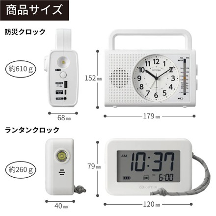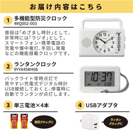 | その他詳細 1 | セット内容 1)シチズン 多機能型防災クロック 4RQ002-003 【メーカー保証】1年間 【付属品】取扱説明書・保証書 2)リズム ランタンクロック 9YYA45RH08 【メーカー保証】1年間 【付属品】ストラップ・USBケーブル(Type- A to C)・取扱説明書・保証書 3)単三電池×4本 4)USBアダプタ |