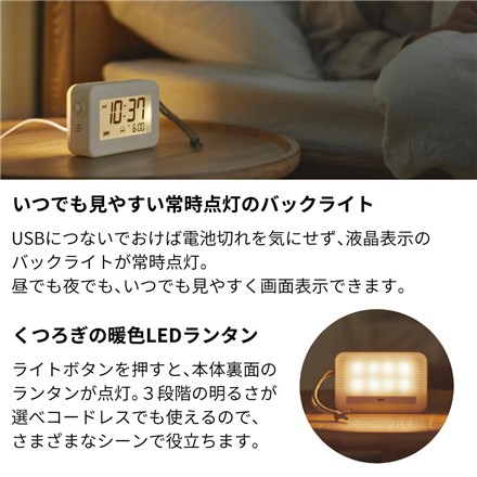 バックライト常時点灯表示で昼夜を問わず時刻が見やすい充電式デジタル時計です。
