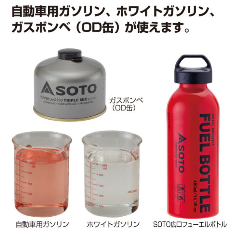 自動車用ガソリン、ホワイトガソリン、ガスボンベ(OD缶)が使えます。