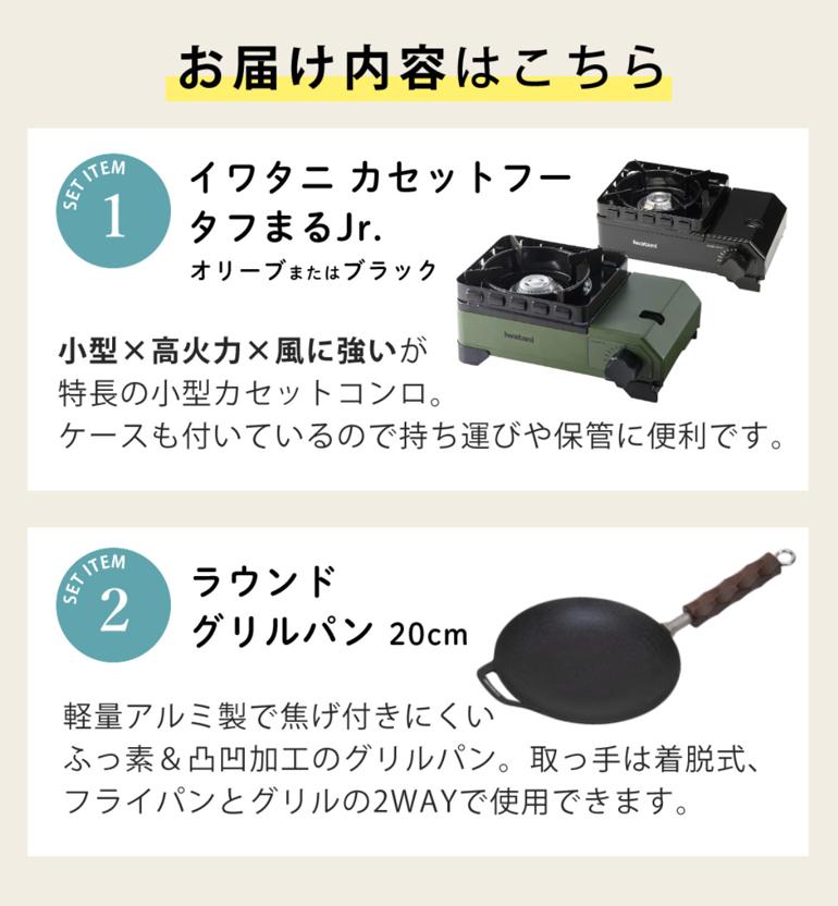 | その他詳細 1 | <セット内容> 1)イワタニ タフまるJr. オリーブ CB-ODX-JR 2)キャプテンスタッグ ラウンド グリルパン 20cm UG-1580 |
