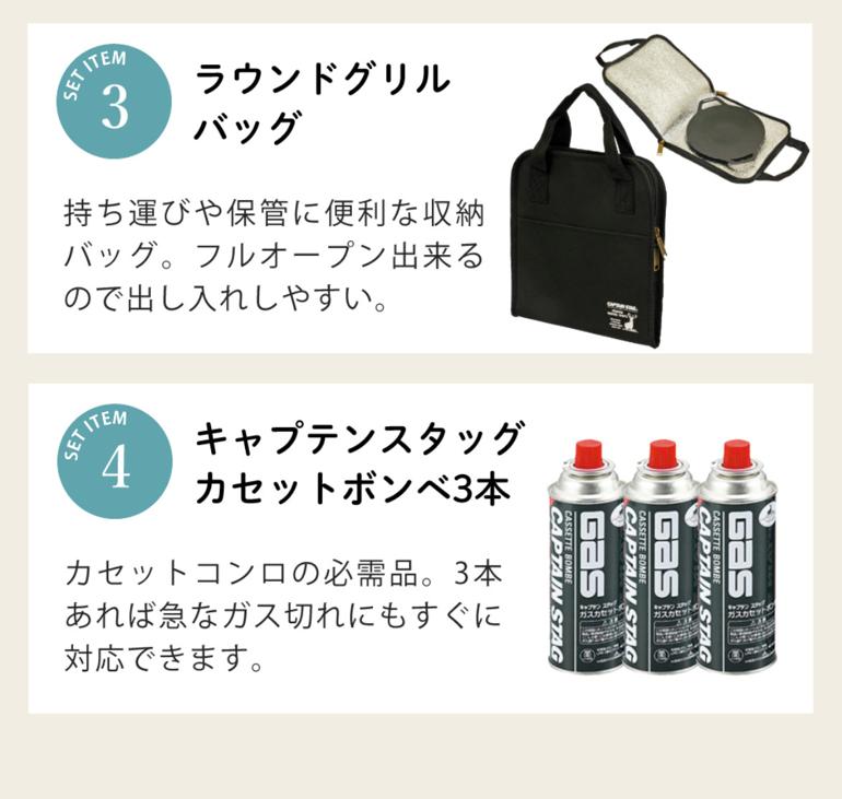 | その他詳細 1 | <セット内容> 1)キャプテンスタッグ ポータブル カセットコンロ ブラック UF-28 2)キャプテンスタッグ ラウンド グリルパン 20cm UG-1580 3)キャプテンスタッグ ラウンドグリル バッグ 20cm用 UG-1587 4)キャプテンスタッグ ガスカセットボンベ3本パック M-7621 |