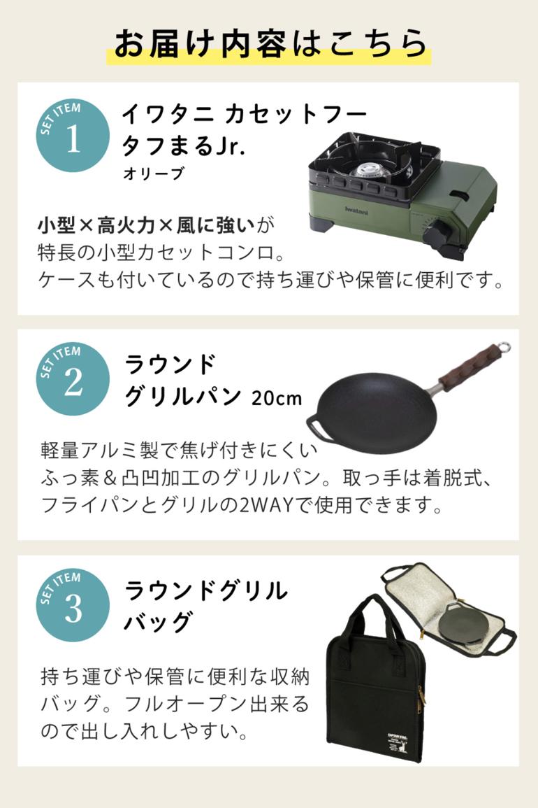 | その他詳細 1 | <セット内容> 1)イワタニ タフまるJr. オリーブ CB-ODX-JR 2)キャプテンスタッグ ラウンド グリルパン 20cm UG-1580 3)キャプテンスタッグ ラウンドグリル バッグ 20cm用 UG-1587 |