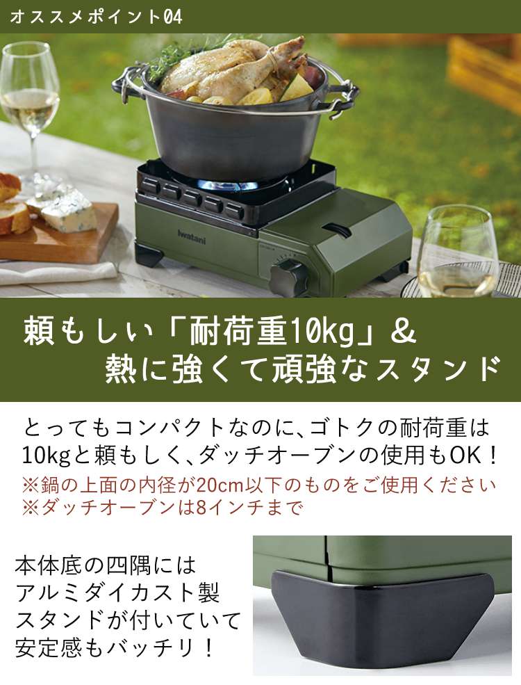 | その他詳細 3 | ●耐荷重20kg・ダッチオーブンOK ※鍋の上面の内径が20cm以下のものをご使用ください。 (ダッチオーブンは8インチまで) ●広がる!アウトドアでの料理の楽しみ お手元の鍋やスキレット、カセットフー専用アクセサリーシリーズ(別売)を組み合わせ、アウトドアで多彩な料理をお楽しみいただけます。 ●イワタニカセットガス、カセットガスジュニア両サイズのカセットガスが使用可能 イワタニカセットガス、カセットガスジュニアとカセットガスパワーゴールドのいずれでもご使用になれます。 ※必ずイワタニカセットガスの表示のある専用容器を使用してください。 他を使用すると正常な使用が出来ない事があります。 |