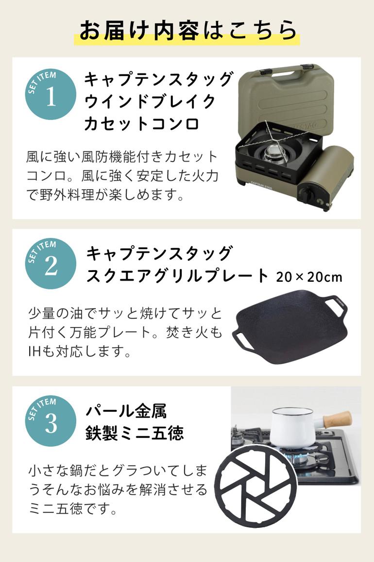| その他詳細 1 | <セット内容> 1)キャプテンスタッグ ウインドブレイク カセットコンロ〈ジュニア〉 UF-31 2)キャプテンスタッグ スクエア グリルプレート20×20cm UG-1582 3)パール金属 鉄製 ミニ ゴトク HB-5001 |