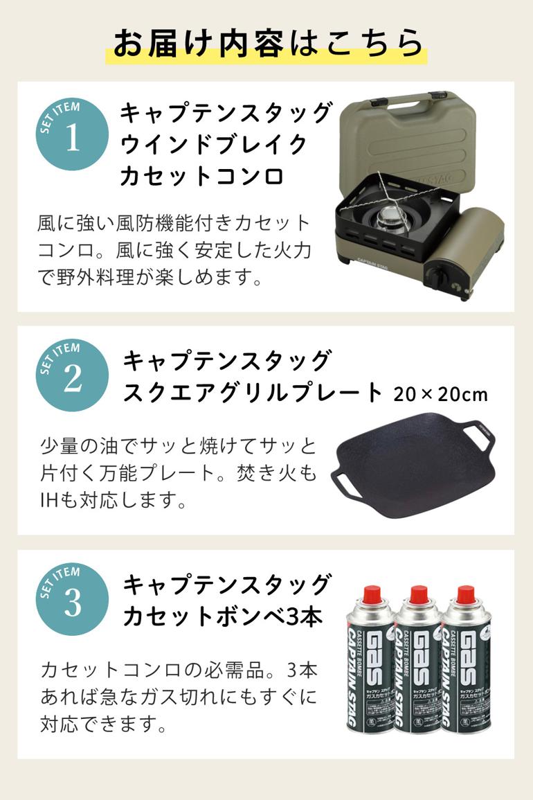 キャプテンスタッグ ウインドブレイク カセットコンロ ジュニア UF-31 & スクエア グリルプレート 20×20cm UG-1582 & ガスカセットボンベ 3本パック M-7621 セット