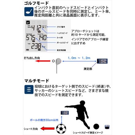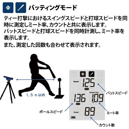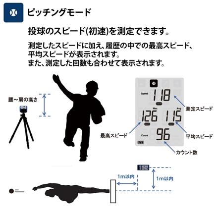 | その他詳細 4 | ・マイクロ波センサー 発振周波数: 24GHz(Kバンド)、送信出力/10mW以下 測定可能範囲 ・ピッチングモード ・バットスイングモード ・バッティングモード=スイングスピード ・ボールスピード 30km/hから180km/h ・マルチモード=スピード 30km/hから300km/h ・ゴルフモード=ヘッドスピード ・ボールスピード 10m/sから90m/s |
