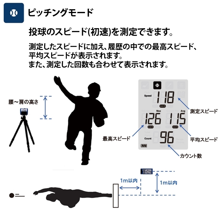 | その他詳細 4 | ・マイクロ波センサー 発振周波数: 24GHz(Kバンド)、送信出力/10mW以下 測定可能範囲 ・ピッチングモード ・バットスイングモード ・バッティングモード=スイングスピード ・ボールスピード 30km/hから180km/h ・マルチモード=スピード 30km/hから300km/h ・ゴルフモード=ヘッドスピード ・ボールスピード 10m/sから90m/s |