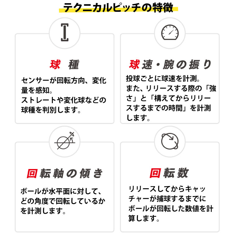 | その他詳細 5 | <SSK テクニカルピッチ TP001 商品説明> ボールとスマートフォンアプリで、効果的な投球トレーニングを! ・ 硬式野球ボールの中心部に9軸センサー(※)を内蔵したIoT製品 ・ ボール本体は、硬式野球ボールと同じ重量、同じ硬さ、同じ素材 ボール本体を投げると投球データがスマートフォンに転送され、「球速、回転数、回転軸、球種、変化量、腕の振りの強さ」を計測し、専用アプリケーションで投球データの解析が可能です。 (※3軸加速度センサー、3軸地磁気センサー、3軸角速度センサー) ボールは 投球練習 専用です。 投手が投げたボールを捕手が捕球する用途のみにご使用ください。 バット等での打撃には利用出来ません。 壁等の障害物に向けて投球することは出来ません。 |