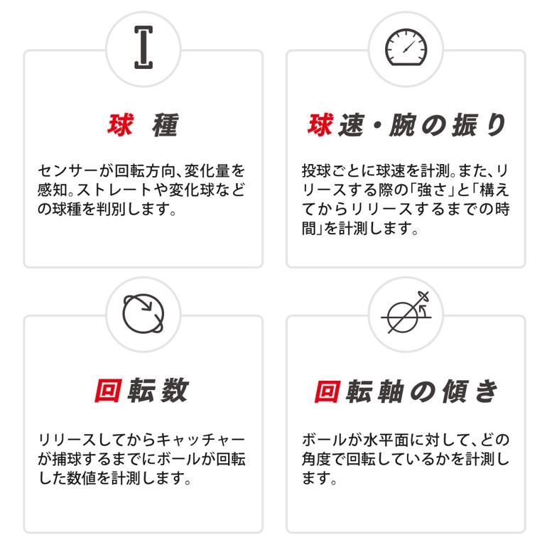 | その他詳細 5 | <SSK テクニカルピッチ TP001> ボールとスマートフォンアプリで、効果的な投球トレーニングを! 硬式野球ボールの中心部に9軸センサー(※)を内蔵したIoT製品 ボール本体は、硬式野球ボールと同じ重量、同じ硬さ、同じ素材 ボール本体を投げると投球データがスマートフォンに転送され、「球速、回転数、回転軸、球種、変化量、腕の振りの強さ」を計測し、専用アプリケーションで投球データの解析が可能です。 (※3軸加速度センサー、3軸地磁気センサー、3軸角速度センサー) ボールは 投球練習 専用です。 投手が投げたボールを捕手が捕球する用途のみにご使用ください。 バット等での打撃には利用出来ません。 壁等の障害物に向けて投球することは出来ません。 |
