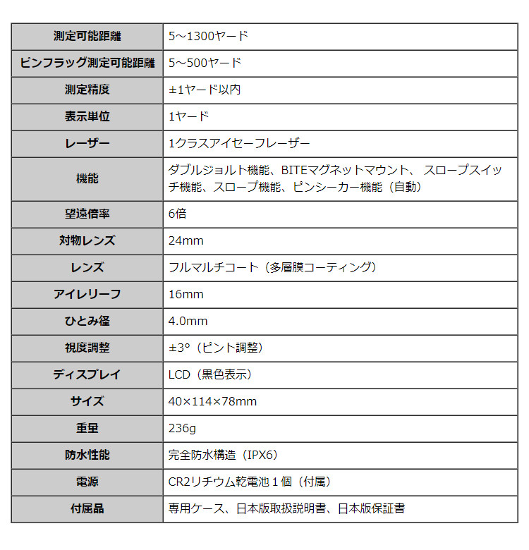 | その他詳細 1 | 測定可能距離 : 5~1300ヤード ピンフラッグ測定可能距離 : 5~500ヤード 測定精度 : ±1ヤード以内 表示単位 : 1ヤード レーザー : 1クラスアイセーフレーザー 機能 : ダブルジョルト機能、BITEマグネットマウント、 スロープスイッチ機能、スロープ機能、ピンシーカー機能(自動) 望遠倍率 : 6倍 対物レンズ : 24mm レンズ : フルマルチコート(多層膜コーティング) アイレリーフ : 16mm ひとみ径 : 4.0mm 視度調整 : ±3°(ピント調整) ディスプレイ : LCD(黒色表示) サイズ : 40×114×78mm 重量 : 236g 防水性能 : 完全防水構造(IPX6) 電源 : CR2リチウム乾電池1個(付属) 付属品 : 専用ケース、日本版取扱説明書、日本版保証書 |