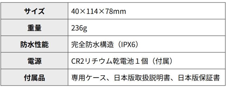 | その他詳細 3 | 望遠倍率:6倍 対物レンズ:24mm レンズ:フルマルチコート(多層膜コーティング) アイレリーフ:16mm ひとみ径:4.0mm 視度調整:±3°(ピント調整) ディスプレイ:LCD(黒色表示) サイズ:40×114×78mm 重量:236g 防水性能:完全防水構造(IPX6) 電源:CR2リチウム乾電池1個(付属) 付属品:専用ケース、日本版取扱説明書、日本版保証書 |
