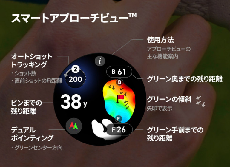 | その他詳細 1 | ディスプレイ:OLED バッテリー持続時間:時計モード5日、ゴルフモード2日(36H) 防水機能:IPX7 バッテリー:充電式(USB Type-C) 通信機能:Bluetooth |