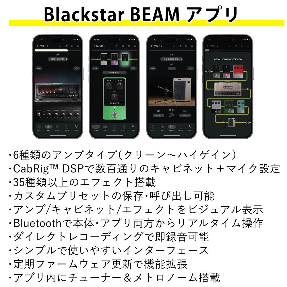 | その他詳細 2 | ●Blackstar BEAMアプリ 6種類の個性豊かなアンプタイプ(クリーン~ハイゲインまで) CabRig(TM) DSPによる6種のキャビネット+6種のマイクで数百通りのサウンドバリエーション 35種類以上のエフェクトを搭載 カスタムプリセットの保存・呼び出しが可能 アンプ/キャビネット/エフェクトのビジュアルをリアルに表示 Bluetooth経由でリアルタイム操作(本体/アプリ両方で) アイデアをすぐに録音できるダイレクトレコーディング機能 わかりやすく使いやすいインターフェース 定期的なファームウェアアップデートで機能拡張 チューナーとメトロノームをアプリ内に搭載 |