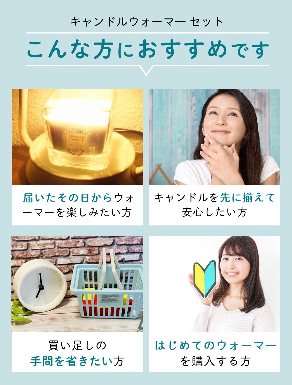 ウォーマーはインテリアに馴染む3色、キャンドルは気分に合わせて選べる7種の香りをご用意しました。それぞれお好きなものを1つずつお選びいただけるカスタマイズセットです。