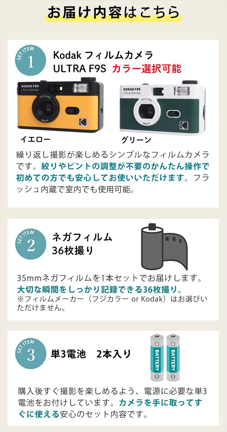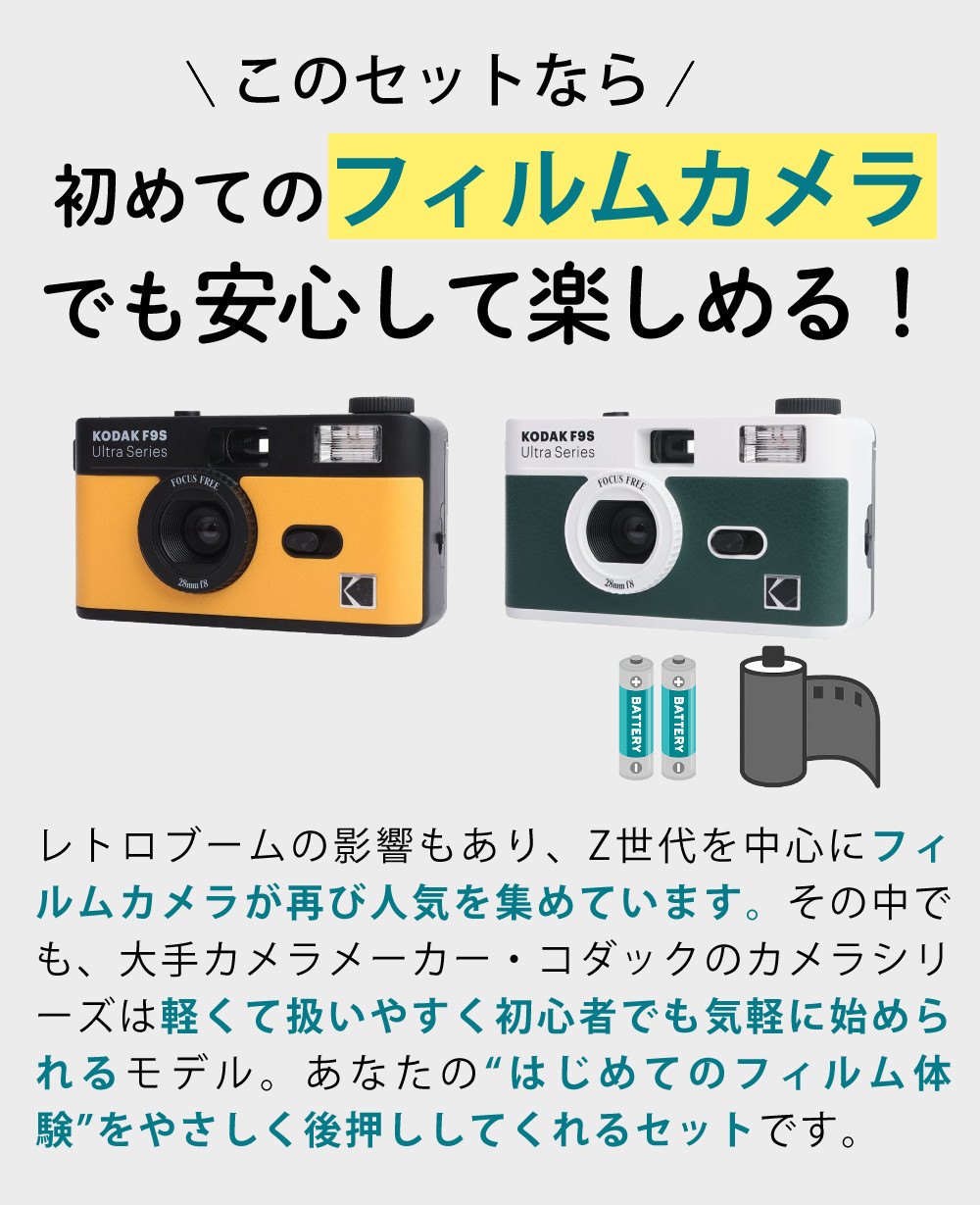 | その他詳細 1 | 【セット内容】 ・KODAK フィルムカメラ ウルトラF9S ・36枚撮 ネガフィルム ・単3アルカリ電池 2本入 |