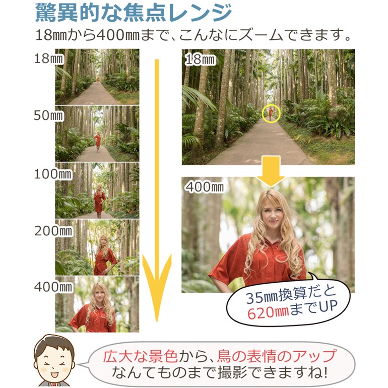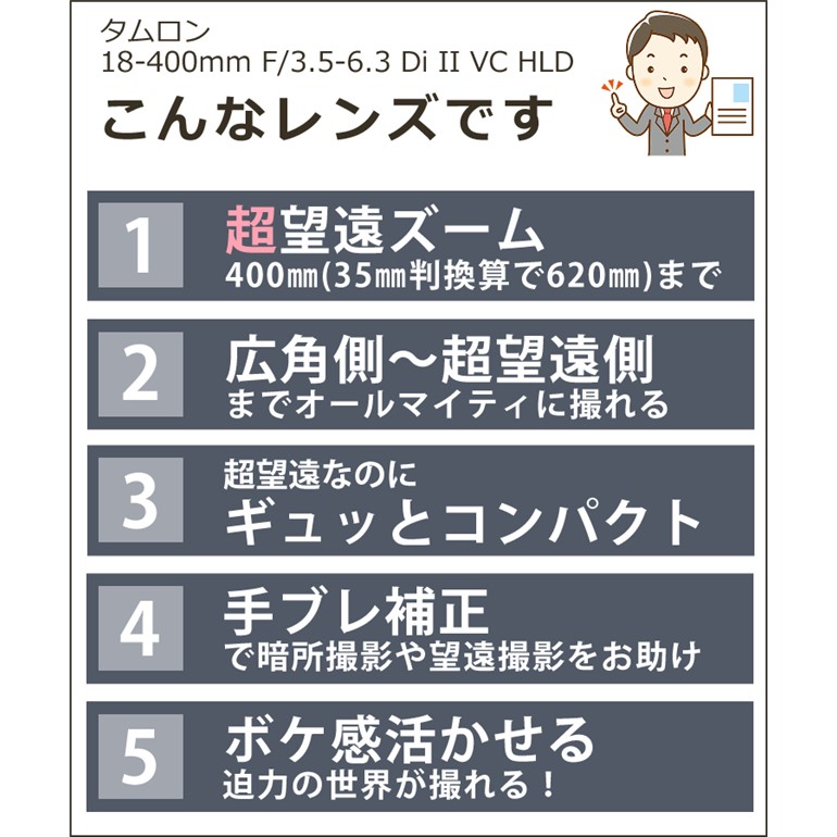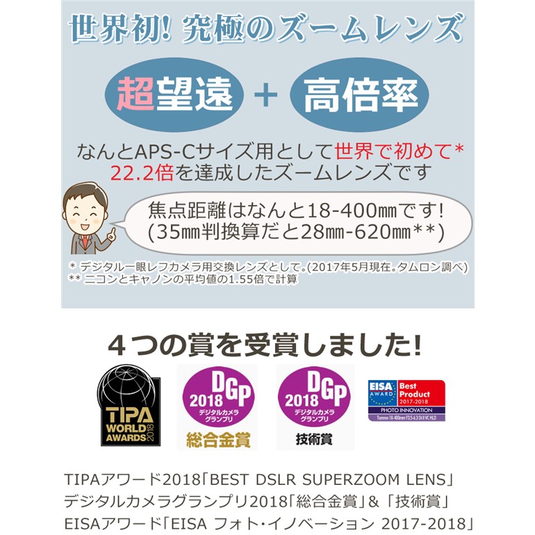 | その他詳細 1 | 【焦点距離】 18-400mm 【明るさ】 F3.5-6.3 |