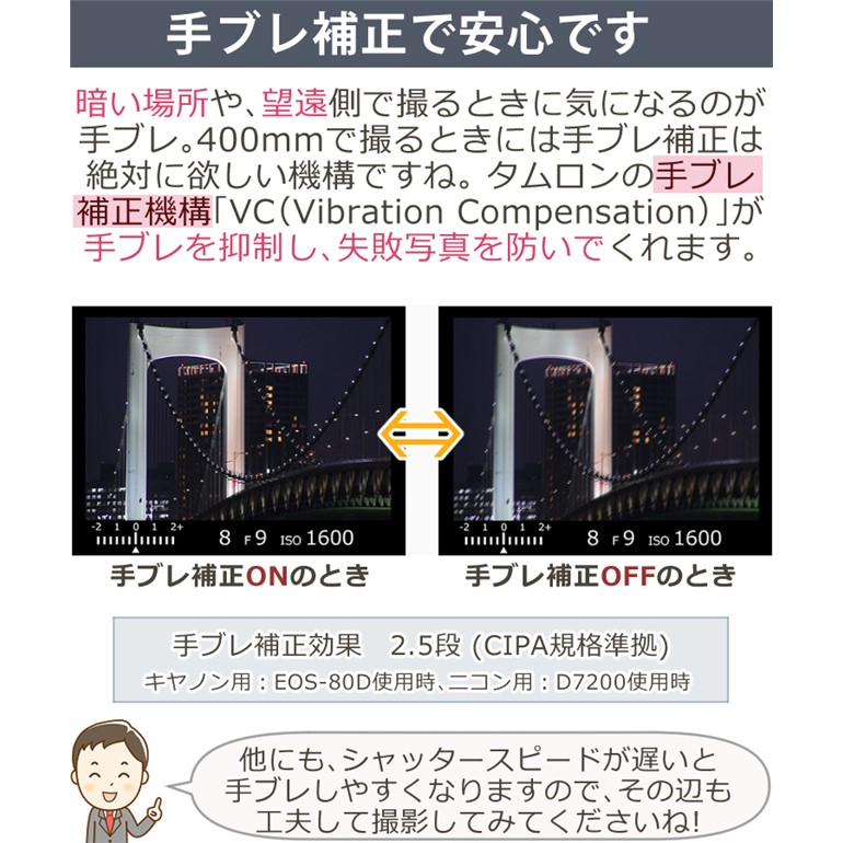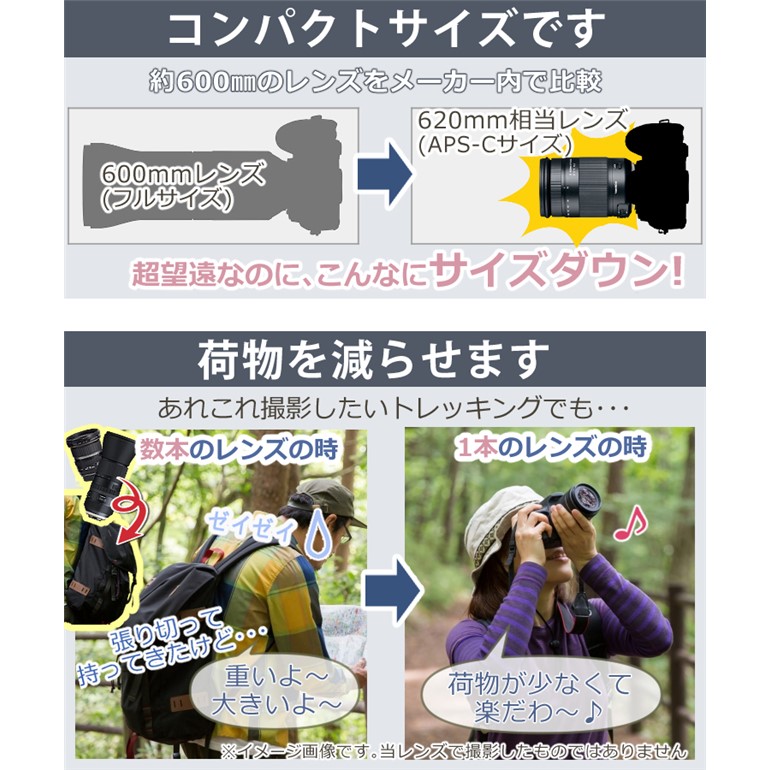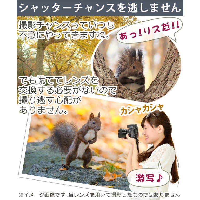 | その他詳細 9 | 【対応カメラ ニコン用】 ◆APS-Cサイズ デジタル一眼レフカメラ D7500/D7200/D7100/D5600/D5500/D5200/D3500/D3400/D3300/D3200/D500 ※35mm判換算で約1.5倍の焦点距離に相当する画角になります。 ◆APS-Cサイズ ミラーレス一眼カメラ Zfc/Z50/Z30 ※ご使用の際には、別途ニコン「マウントアダプター FTZ / FTZ II」が必要です。 ※35mm判換算で約1.5倍の焦点距離に相当する画角になります。 |