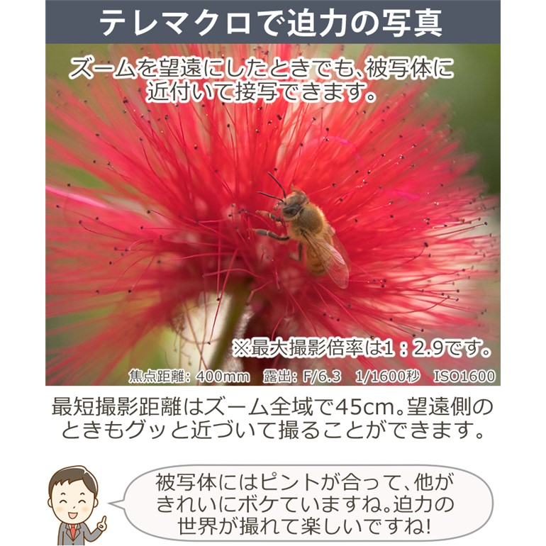 | その他詳細 4 | 【最短撮影距離】 0.45m 【最大撮影倍率】 1:2.9 |