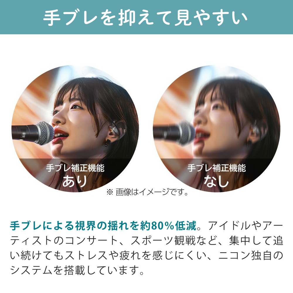 コンパクトサイズで持ち運びやすく、手ブレ補正機能が搭載されているため、スタジアムフェスやコンサート視聴でもクリアな視界をキープします。