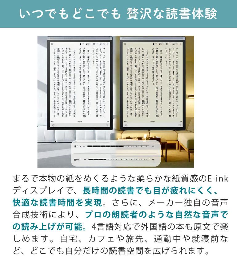 まるで本物の紙をめくるような柔らかな紙質感のE-inkディスプレイで、長時間の読書でも目が疲れにくく、