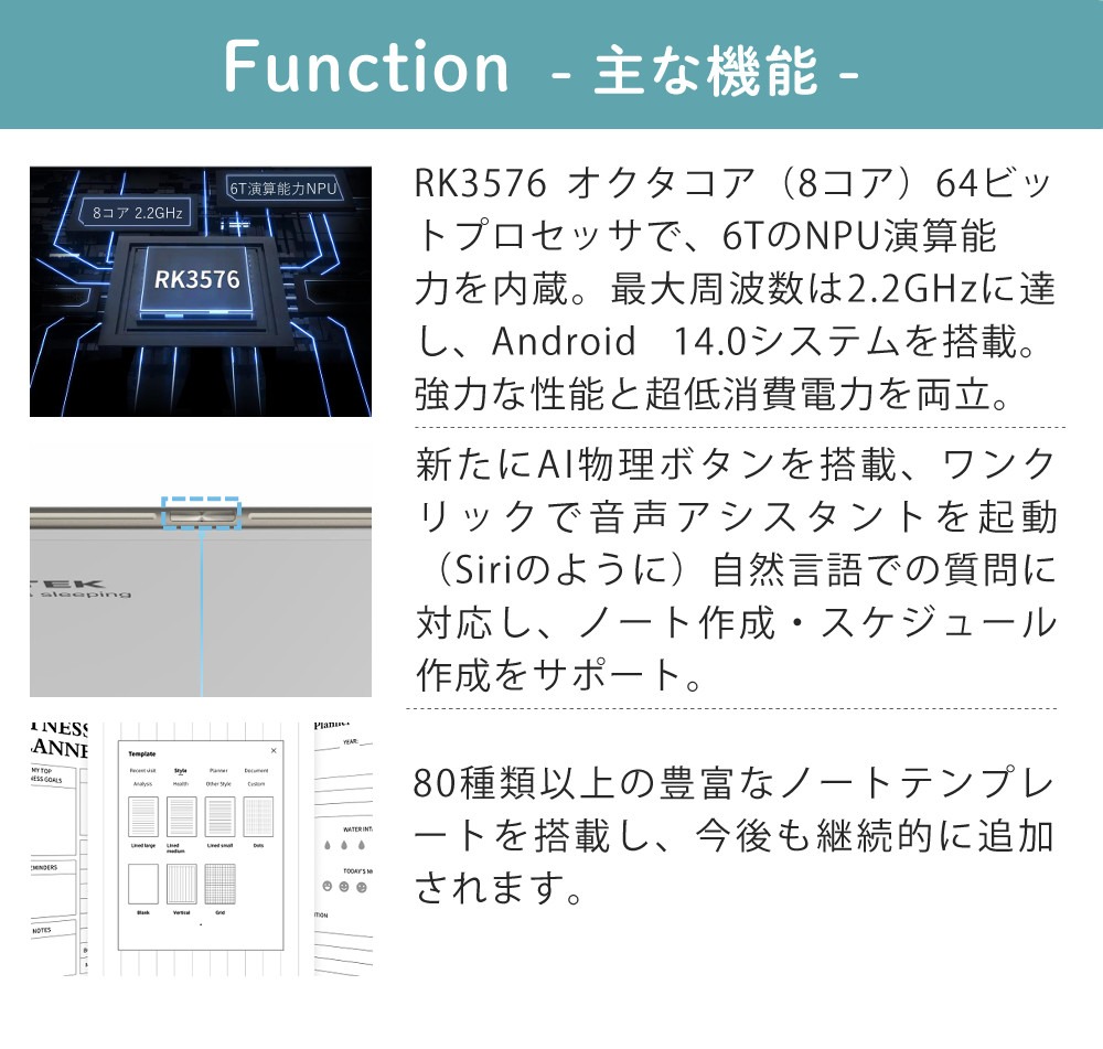 | その他詳細 8 | OS:Android 14(GMS認証済み) 対応ファイル形式:pdf/epub/txt/mobi/azw/jpeg/png/doc(x)/xls(x)/ppt(x) |