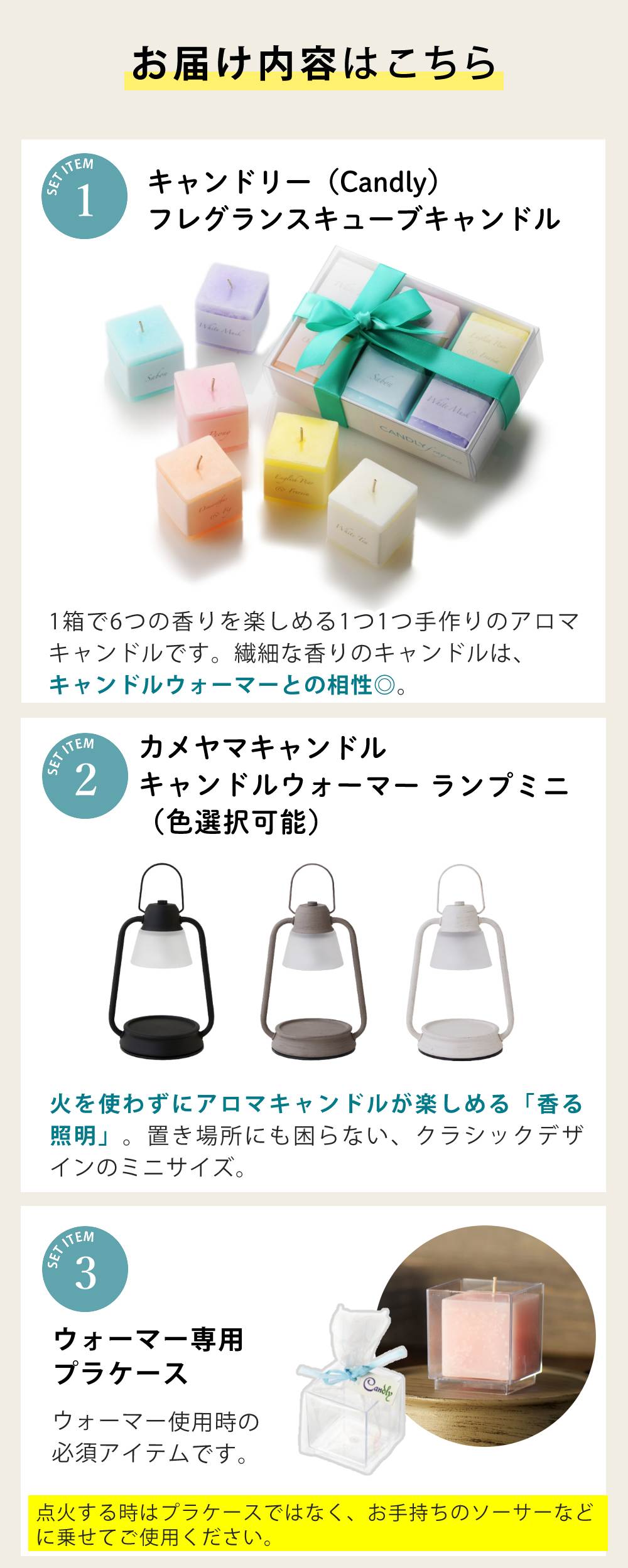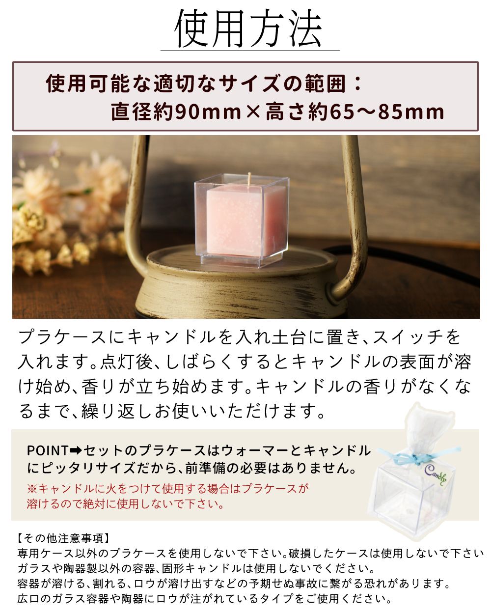 | その他詳細 3 | 【ご注意】 キャンドルに火を灯して使用する際は、付属のプラケースは絶対に使用しないで下さい。プラケースが溶ける恐れがあります。 |