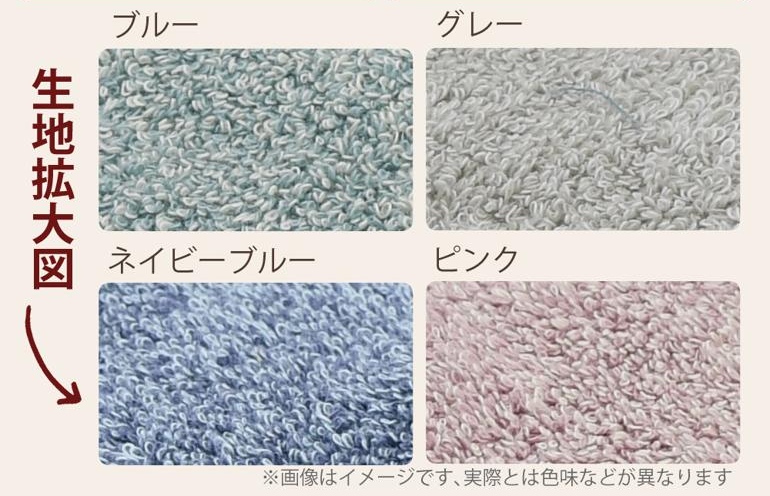 | 特長 | 抗菌防臭加工付き、甘撚り糸使用、高吸水素材使用、綿93%・ポリエステル7%(パイル糸は綿100%)、中国製 |
