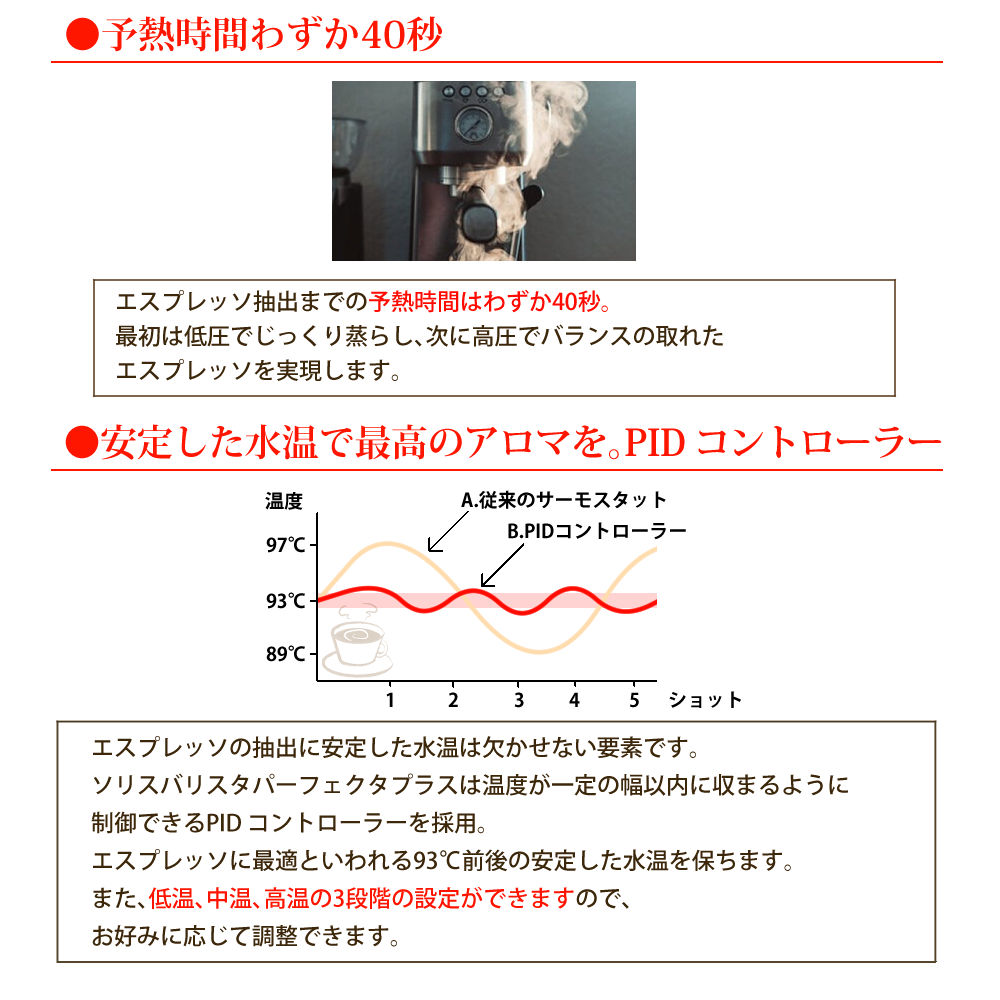 ソリスバリスタパーフェクタプラスは温度が一定の幅以内に収まるように制御できるPID コントローラーを採用。