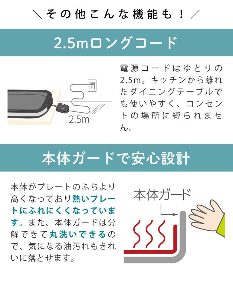 本体がプレートのふちより高くなっており熱いプレートにふれにくくなっています。また、本体ガードは分解できて丸洗いできるので、気になる油汚れもきれいに落とせます。