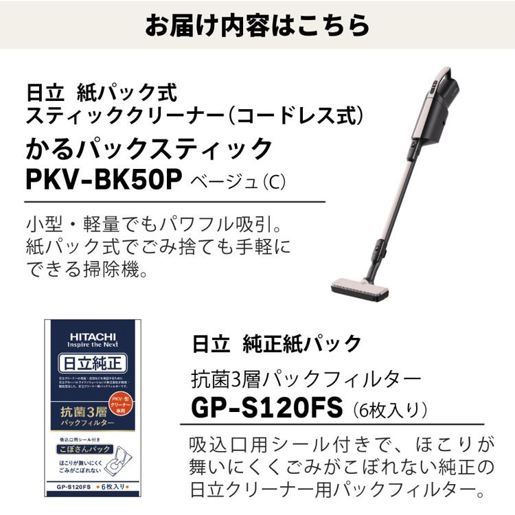 日立 掃除機 紙パック式 かるパックスティック スティッククリーナー コードレス ベージュ 日本製 PKV-BK50P & 紙パック (6枚入) GP-S120FS