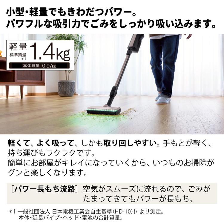 | 重量 | <掃除機> 【標準質量(スティック時)】1.4kg *1 ※標準質量は本体・延長パイプ・ヘッド・電池の合計質量です。 【本体質量(ハンディ時)】0.97kg *1 ※本体質量は電池を含みます。 |