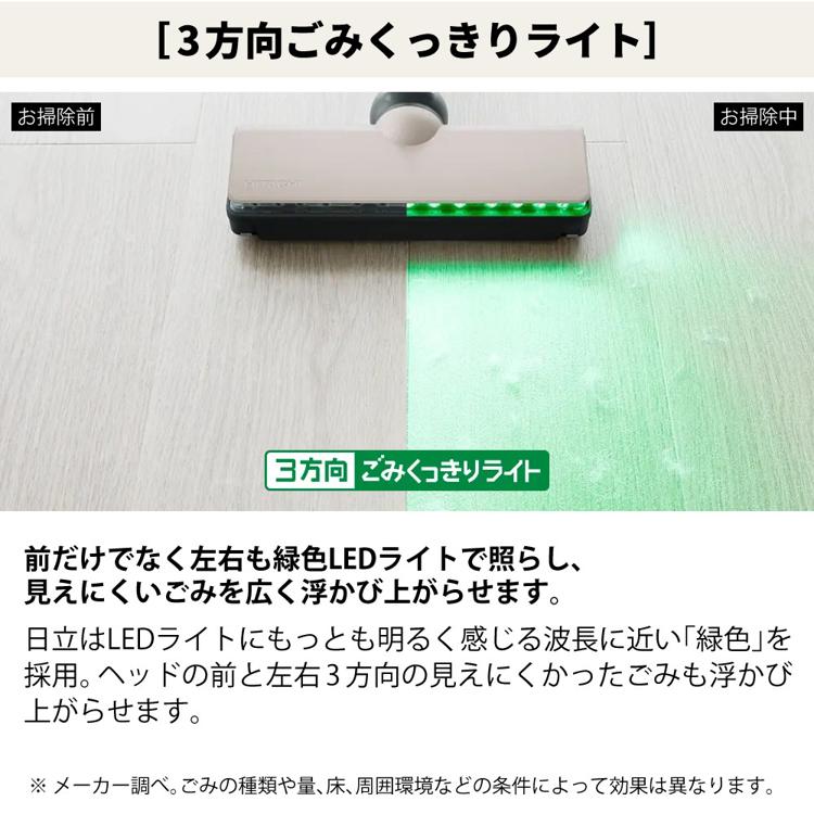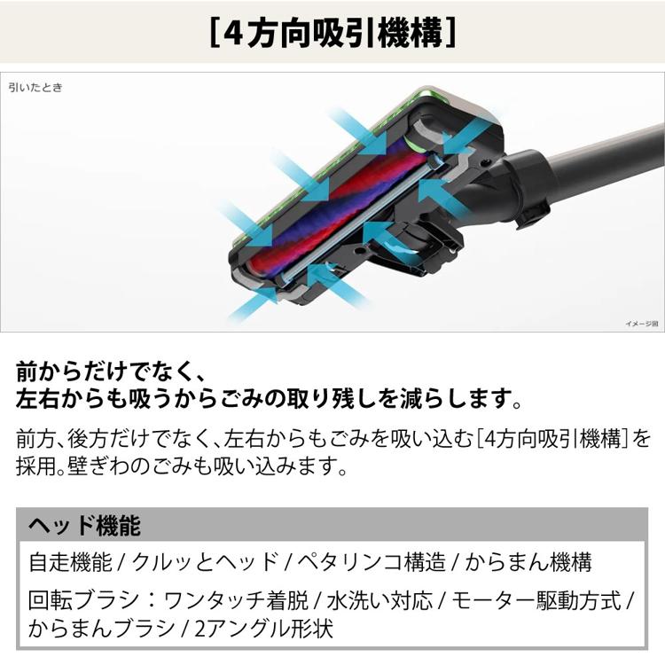 | その他詳細 2 | 【ヘッド】 ヘッド幅:約23cm ブラシ水洗い対応/3方向ごみくっきりライト/4方向吸引機構 【ヘッド機能】 自走機能/クルッとヘッド/ペタリンコ構造/からまん機構 回転ブラシ:ワンタッチ着脱/水洗い対応/モーター駆動方式/からまんブラシ/2アングル形状 |