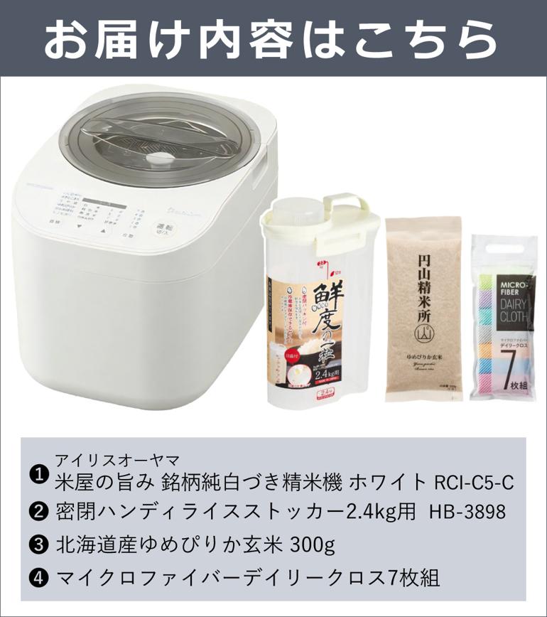 アイリスオーヤマ 米屋の旨み 銘柄純白づき精米機 RCI-C5-C ホワイト &ライスストッカー HB-3898&ゆめぴりか玄米(300g)&マイクロファイバークロス