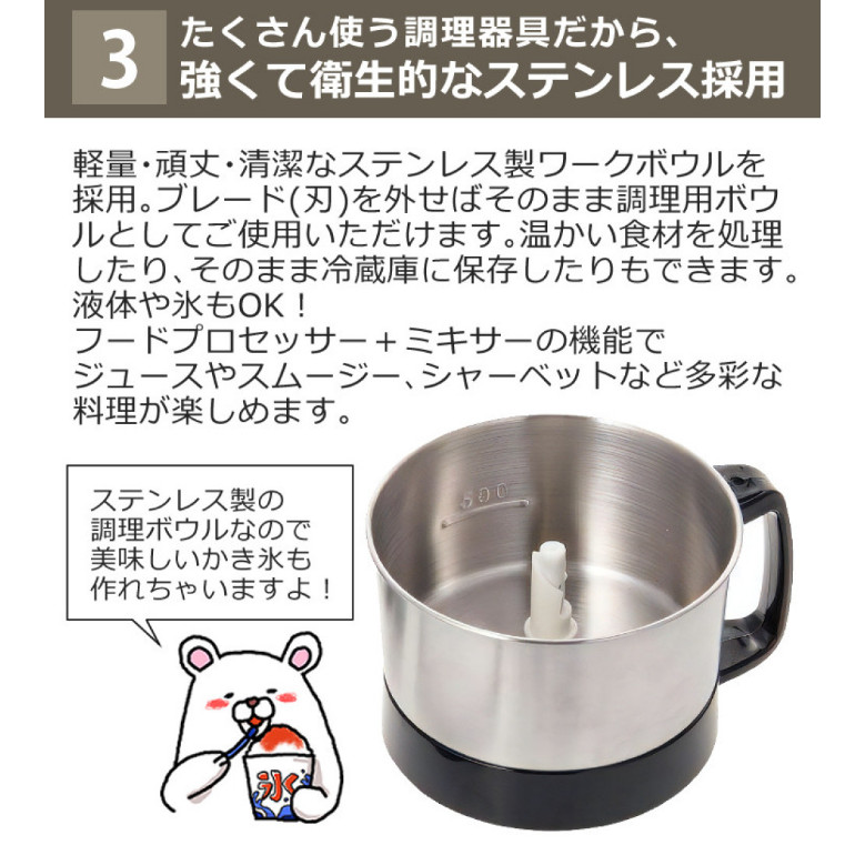 | 内容量 | 一回に調理できる最大量500g(ハンバーグの場合)、500ml(ジュースの場合) |