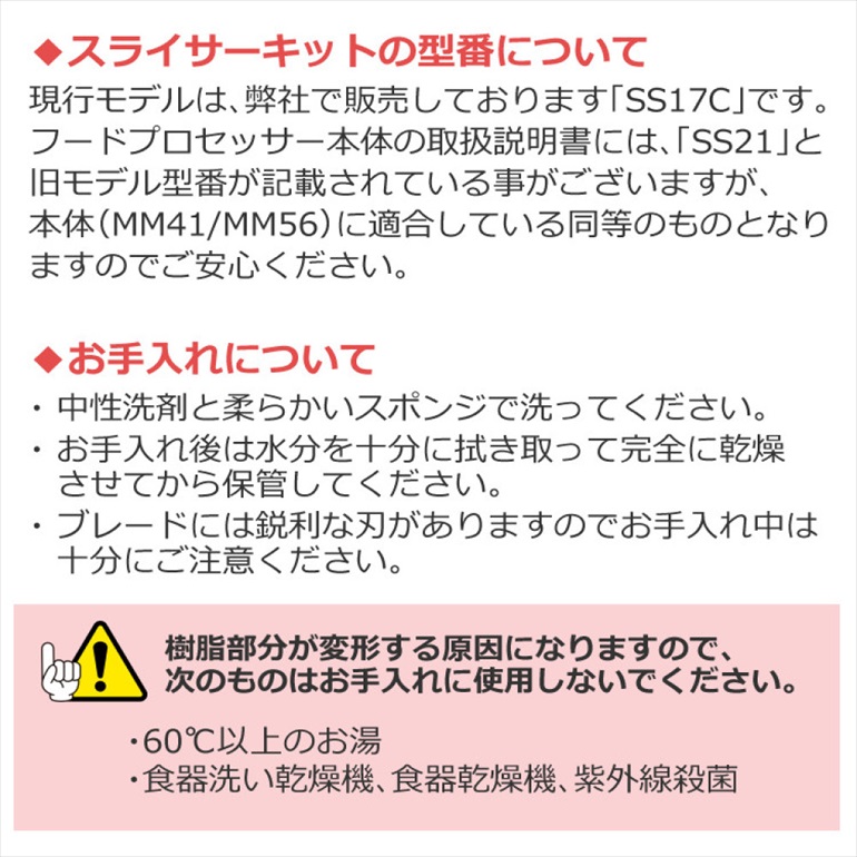 | その他詳細 2 | (スライサーキット 仕様) ■商品サイズ:約幅170×高さ210×奥行160mm ■質量:約1.1kg ■対応機種:マルチスピードミキサー MMシリーズ ■生産国:中国 ■材質素材:専用カバー:AS/ドライパッキン:シリコンゴム/ブレード:SUS・POM/ジョイント:POM/押し込み棒:AS/エッグビーター(泡立て羽根):PP ■メーカー保証:1年間 |