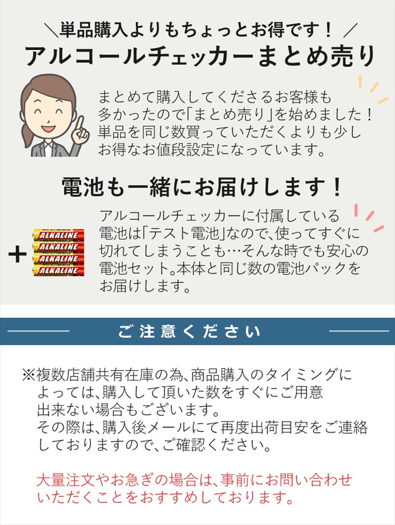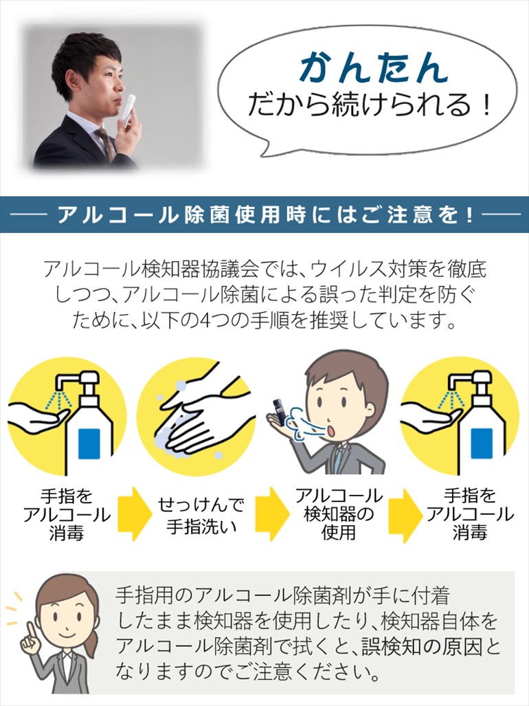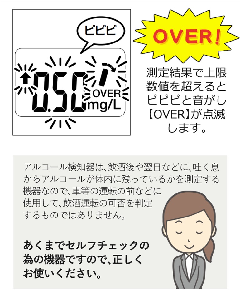 ※アルコール検知器は、飲酒後や翌日などに、吐く息からアルコールが体内に残っているかを測定する機器なので、車等の運転の前などに使用して、飲酒運転の可否を判定するものではありません。あくまでセルフチェックの為の機器ですので、正しくお使いください。