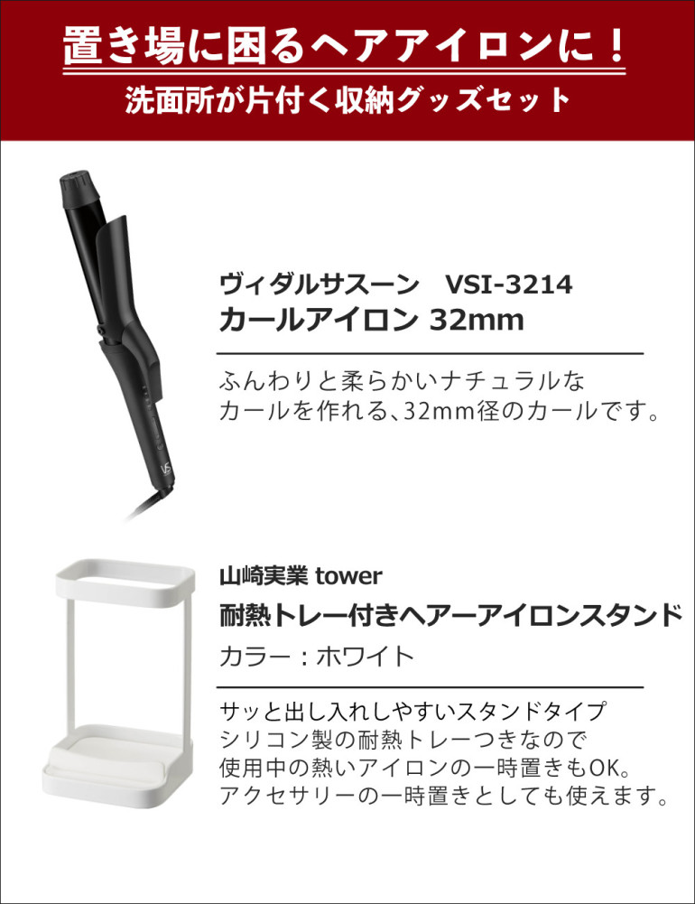 ヴィダルサスーン 32mm幅 カールアイロン VSI-3214KJ & 山崎実業 tower 5062 耐熱トレー付きヘアーアイロンスタンド ホワイト