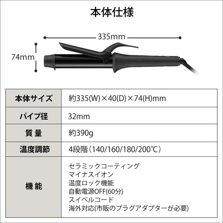 | その他詳細 1 | 【電源】AC100V-240V 50/60Hz共用 【消費電力】59W 【プレート】セラミックコーティング 【パイプ径】32mm 【プレート最高温度】200℃ *周囲温度30℃のとき 【機能】マイナスイオン、温度ロック機能、自動電源OFF(60分)、スイベルコード、海外対応(市販のプラグアダプターが必要) 【コード長さ】約1.7m 【付属品】取扱説明書(保証書付) |