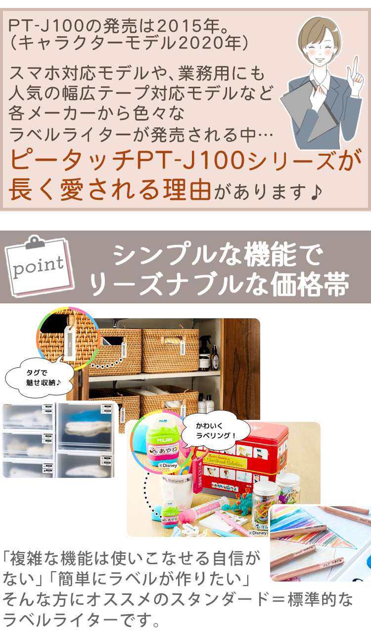 | その他詳細 4 | [本体パッケージ内容] ピータッチJ100本体、サンプルテープカセット(12mm幅/白テープ黒文字)1本、取扱説明書(保証書付き)、テープカタログ |