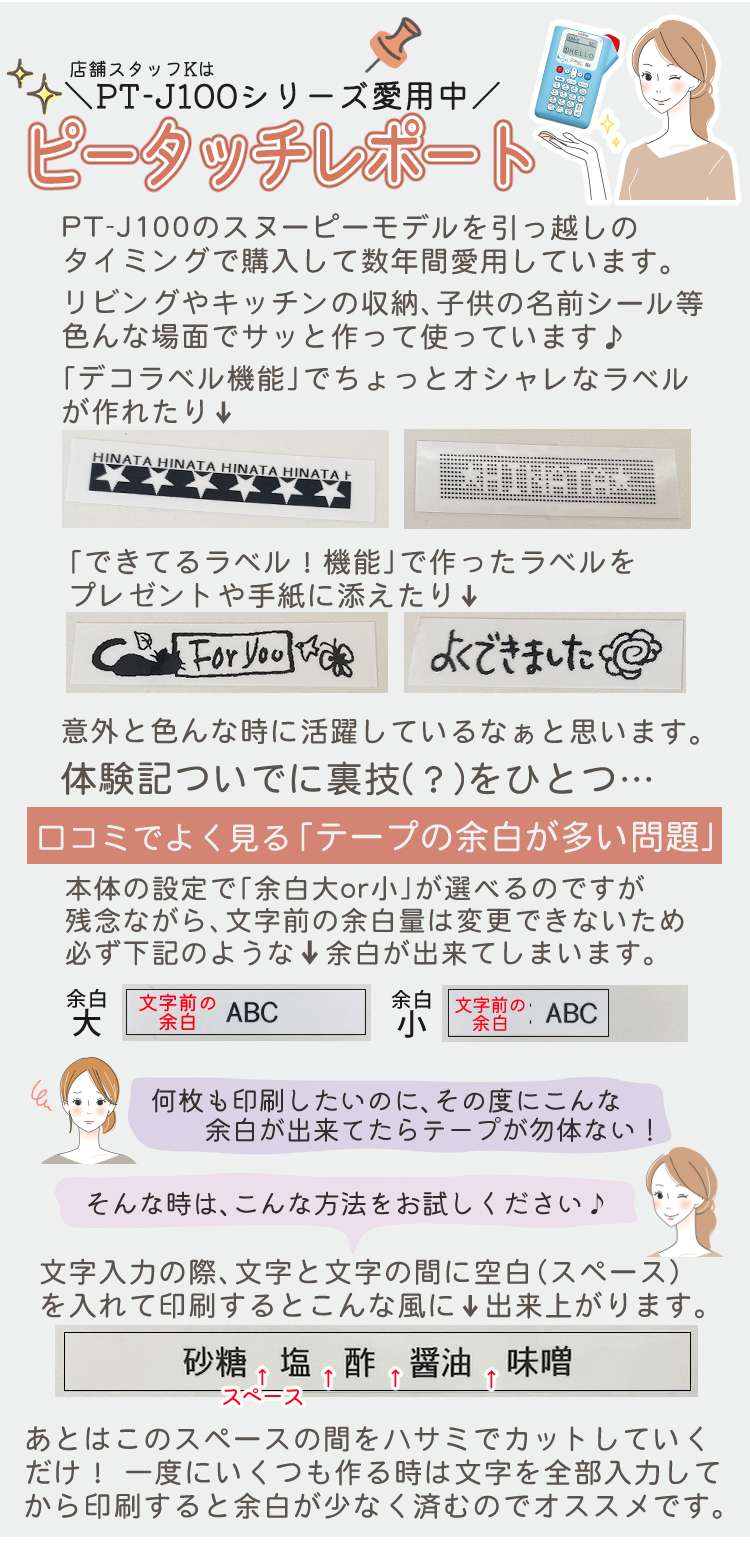 | その他詳細 5 | [セット内容] 1)ピータッチ PT-J100 本体(カラーを選択) 2)純正専用テープ 白テープ(黒文字)/9mm幅 TZe-221 3)純正専用テープ 白テープ(黒文字)/12mm幅 TZe-231 4)純正専用テープ 透明テープ(黒文字)/12mm幅 TZe-131 5)純正専用テープ 黒テープ 1本(3種類から選択) 6)単4電池4本×2パック(合計8本) |