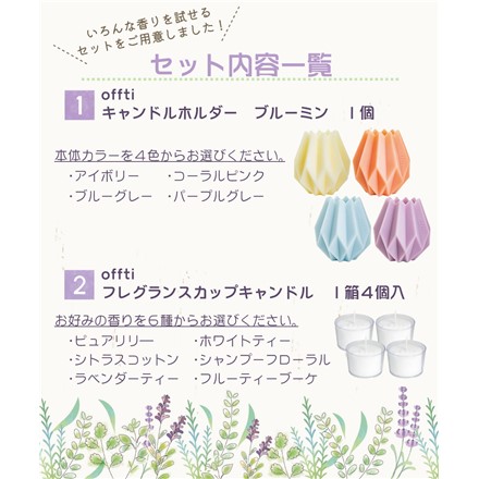 | 1)Offti キャンドルホルダー ブルーミン(カラー4種からお選びください) 【付属品】カップキャンドル(ピュアリリ―の香り) 4個 |