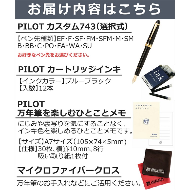 | その他詳細 3 | 【セット内容】 1) パイロット 万年筆 カスタム743 FKK-3000R-B-SF 2) パイロット カートリッジインキ IRF-12S-BB ブルーブラック 3) パイロット 万年筆を楽しむひとことメモ(縦型縦罫) RP-M01 4) マイクロファイバークロス |