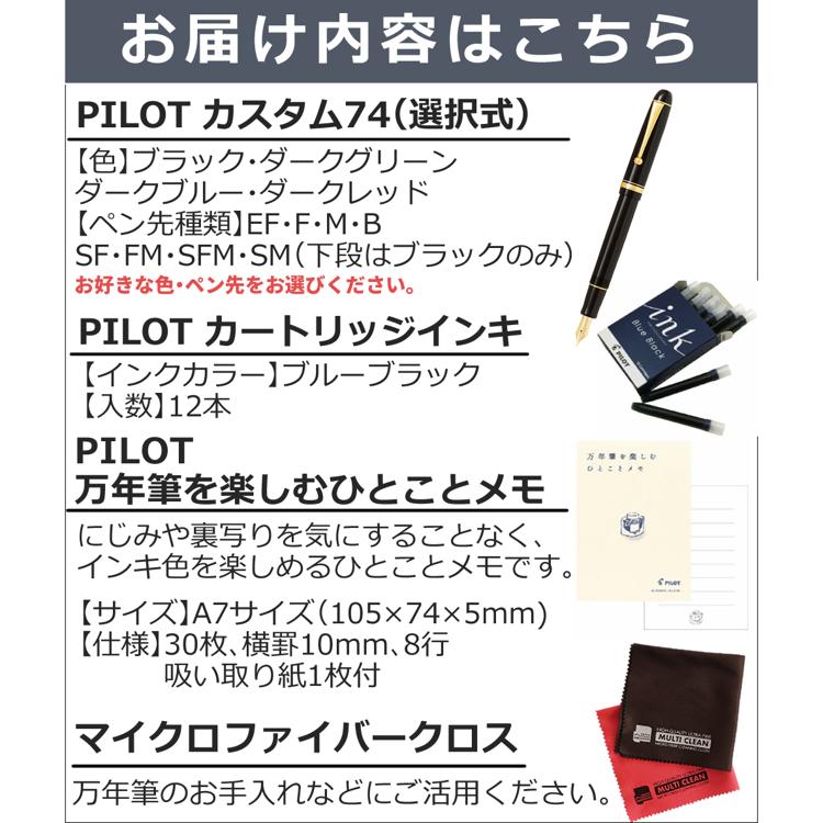 | その他詳細 4 | 【セット内容】 1)パイロット 万年筆 カスタム74 FKKN-12SR 【生産国】日本 2) パイロット カートリッジインキ IRF-12S-BB ブルーブラック 【入数】12本 3) パイロット 万年筆を楽しむひとことメモ(縦型縦罫) RP-M01 【サイズ】A7サイズ(105×74×5mm) 【仕様】30枚、横罫10mm、8行、吸い取り紙1枚付 4) マイクロファイバークロス |