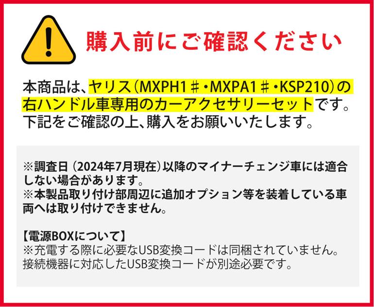 | その他詳細 3 | 4. 槌屋ヤック 電源 BOX ● ヤリス(MXPH10/15・MXPA10/15・KSP210)・ヤリスクロス(MXPB10/15・MXPJ10/15)・GRヤリス(MXPA12)の右ハンドル車専用です。 ● 専用設計で、フロントコンソールにピッタリフィット。 ● ソケット2口とUSBポート2口を簡単増設。 ● 機器に合わせて、最適な電流を供給して充電するUSB自動認識機能付き。 ● 通電すると、フロントコンソールをイルミネーションランプでブルーに照らす。 ● アクセサリーソケットにカープラグ部を挿し込むだけ。両面テープで簡単装着。 パッケージサイズ:H180×W175×D70mm カラー:ブラック JANコード:4979969012644 |