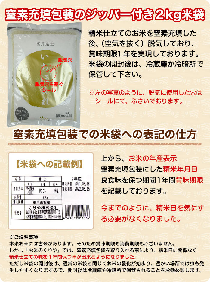 | 保存方法 | 直射日光の当たらない涼しい場所 ※開封後は、通常の米袋と同じです。 冷蔵庫か冷暗所で保管してください。 |