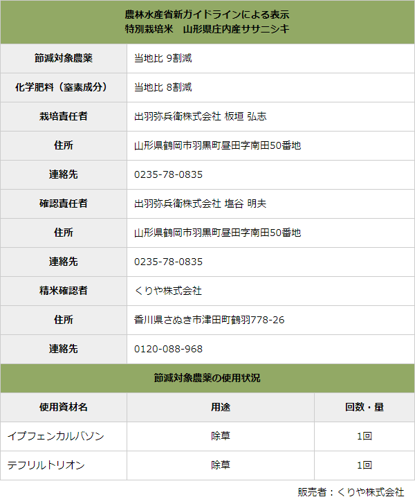 | 原産国・原産地 | 山形県庄内産 品種:ササニシキ |