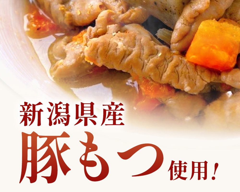 | 原材料/素材/材質 | 豚もつ(新潟県産)、大根、ごぼう、こんにゃく、にんじん、にんにく、しょうが、味噌、しょうゆ、/調味料(アミノ酸)、(一部に豚肉、小麦、大豆を含む)/水酸化カルシウム |