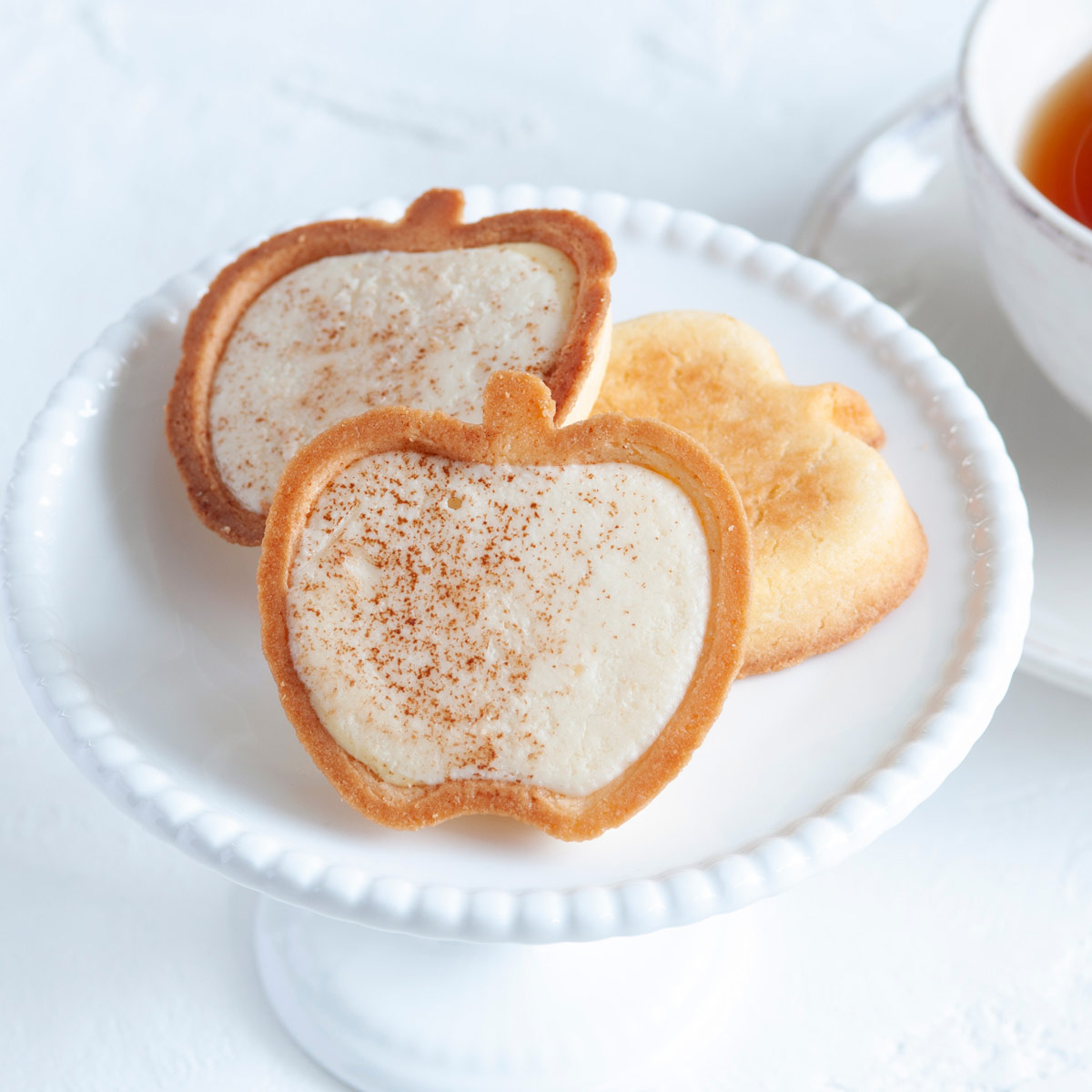 <りんごのクッキー>りんごを使用したチョコレートをバター風味のクッキーではさみました。アップルバターのやさしい甘み、サクッとした食感をお楽しみください。