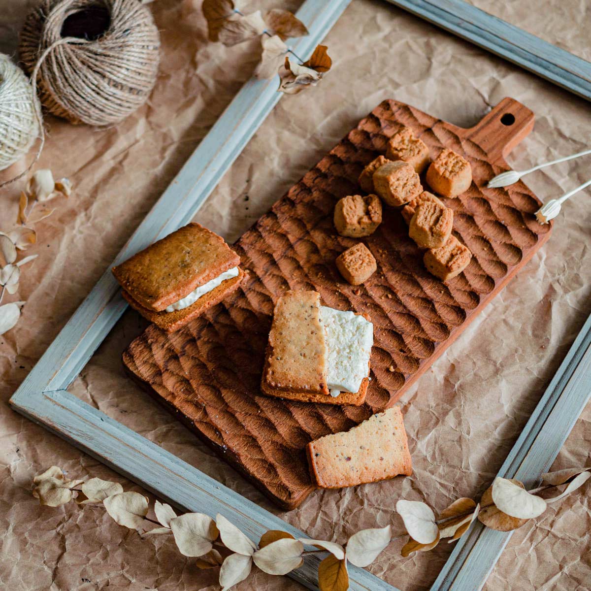 <チーズサンド>2種の熟成チーズをクッキー生地に練りこんで焼き上げました。濃厚なクリームチーズに練りこんだライスパフがアクセント。
