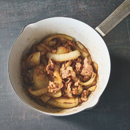 玉ねぎと牛肉を焼きつけて旨みを凝縮。